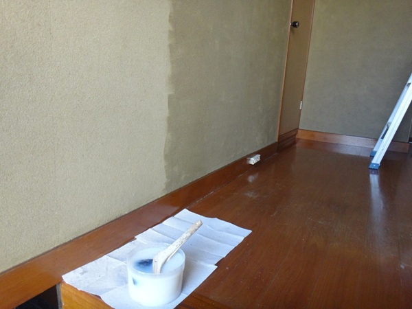 今回はシーラーも使用しました。砂壁は吸い込みが強いため、そのまま壁紙を貼ると接着が弱くなる可能性があると感じたからです。